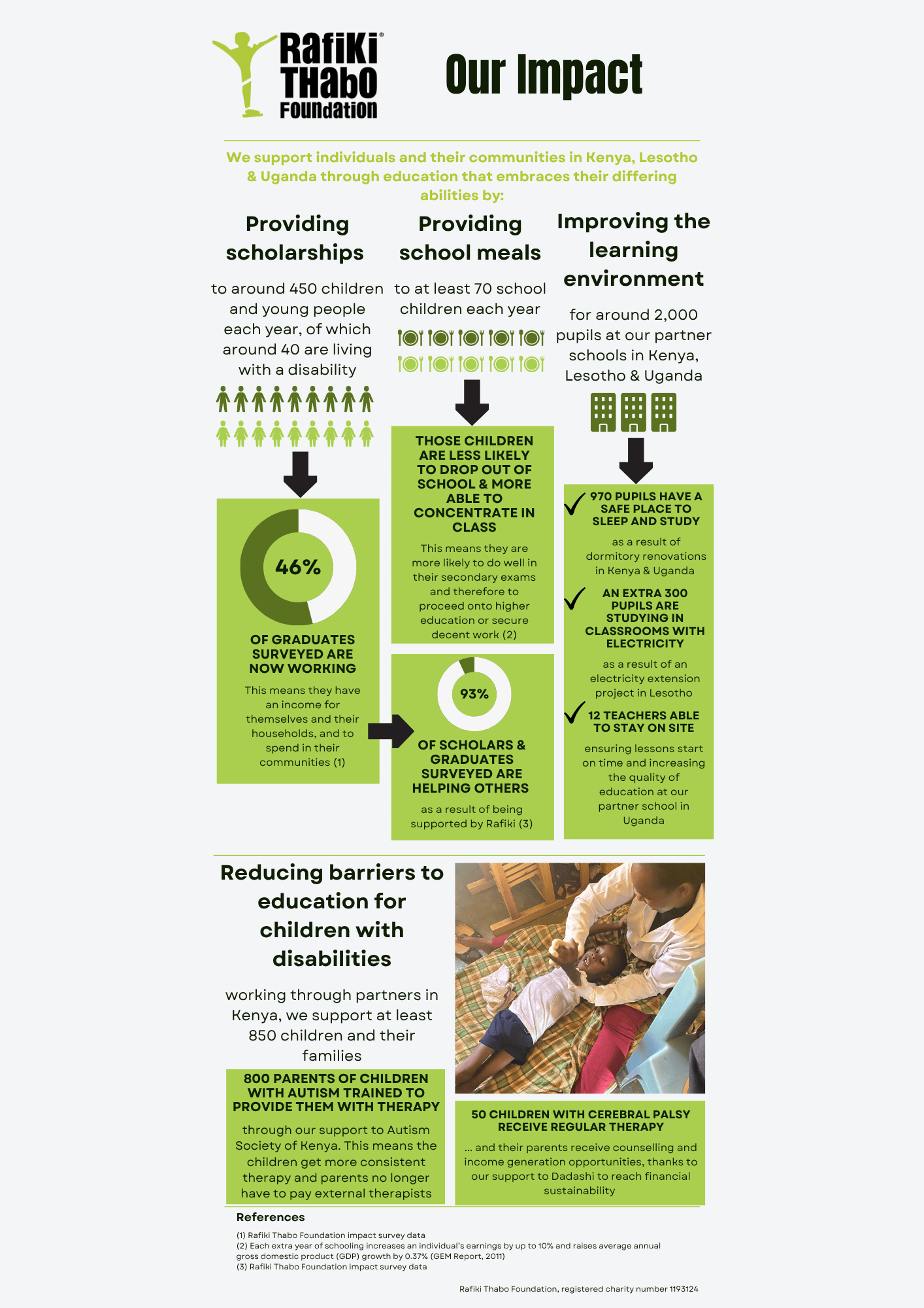 Our support to individual scholars has an incredible impact – not just on their lives, but those of their families, their friends, and their future children. According to our impact surveys, most scholars are also actively helping others in their local communities as a result of being helped by Rafiki Thabo. Once they have secured employment or started a business, they also contribute economically to the local community and the wider economy.